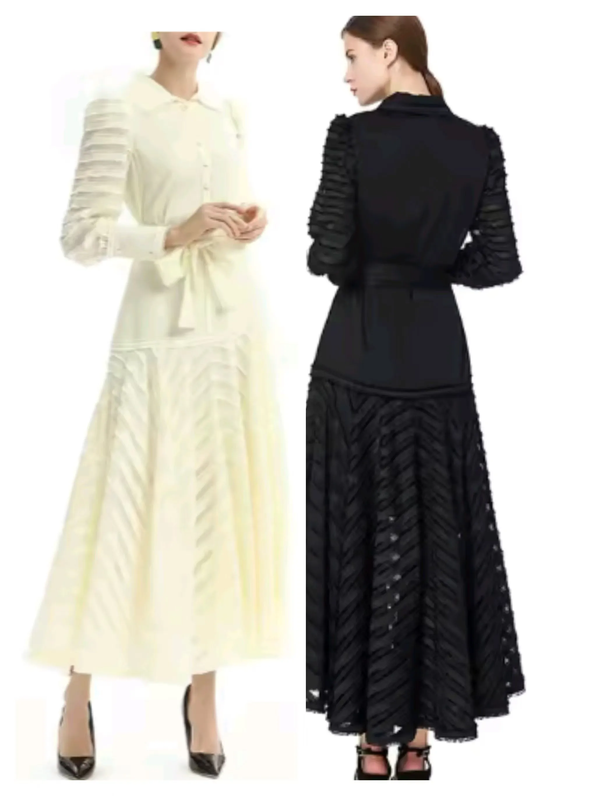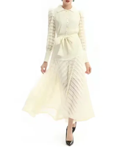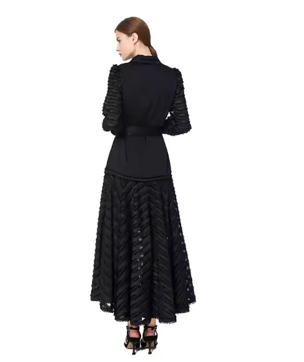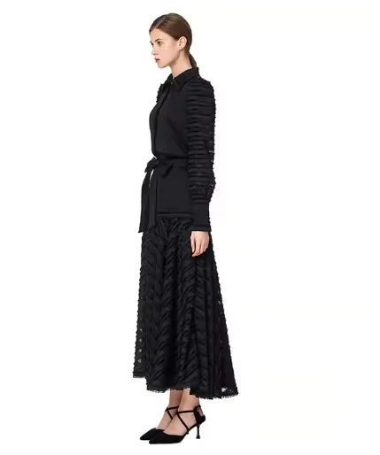 High Quality Custom Women's Gothic Mid-Length A-Line Dress Solid Color Lace Decoration Long Sleeve Striped Flared Midi Dress